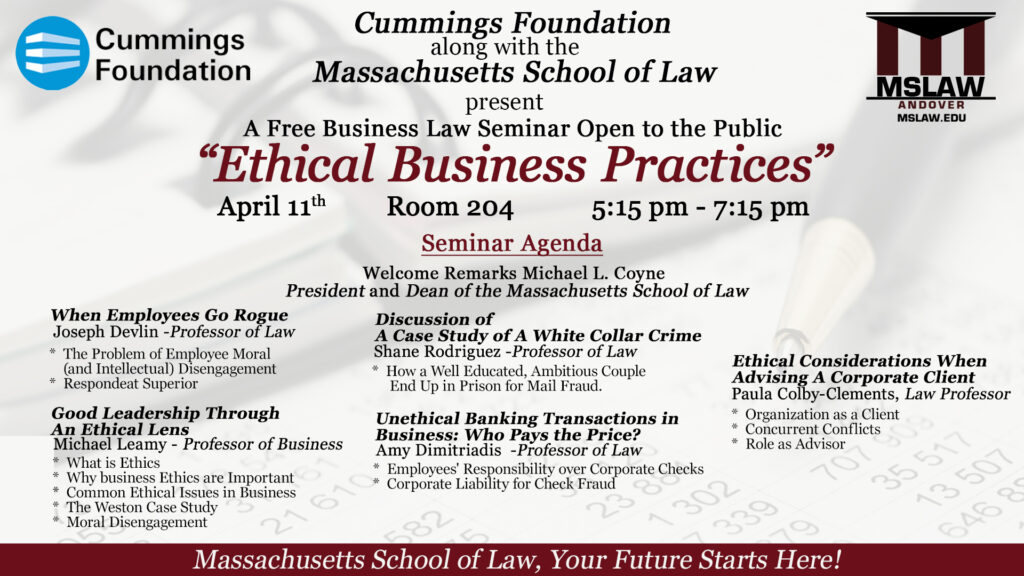 REGISTER FOR THE UPCOMING NOVEMBER 13th CUMMINGS SEMINAR!The Cummings Foundation and Massachusetts School of Law hosted a seminar focused on Ethical Business Practices, Thursday, April 11th, at Massachusetts School of Law – 500 Federal Street, Andover MA, 01810. This was the fourth seminar in the series of Cummings Business Law Seminars. These sessions provide a free informative seminar to the public to educate on the interplay between business and law. Slide DecksProfessor Joseph Devlin – When Employees Go RogueProfessor Michael Leamy – Good Leadership Through An Ethical LensProfessor Amy Dimitriadis – Unethical Banking Transactions in Business: Who Pays the Price?Professor Paula Colby-Clements – Ethical Considerations When Advising A Corporate Client PodcastsDean Michael L. Coyne – Welcome and IntroductionProfessor Joseph Devlin – When Employees Go RogueProfessor Michael Leamy – Good Leadership Through An Ethical LensProfessor Amy Dimitriadis – Unethical Banking Transactions in Business: Who Pays the Price?Professor Paula Colby-Clements – Ethical Considerations When Advising A Corporate Client Previous SessionsBusiness Management ConsiderationsFinancial Literacy for ProfessionalsTech Issues in Business and Education
