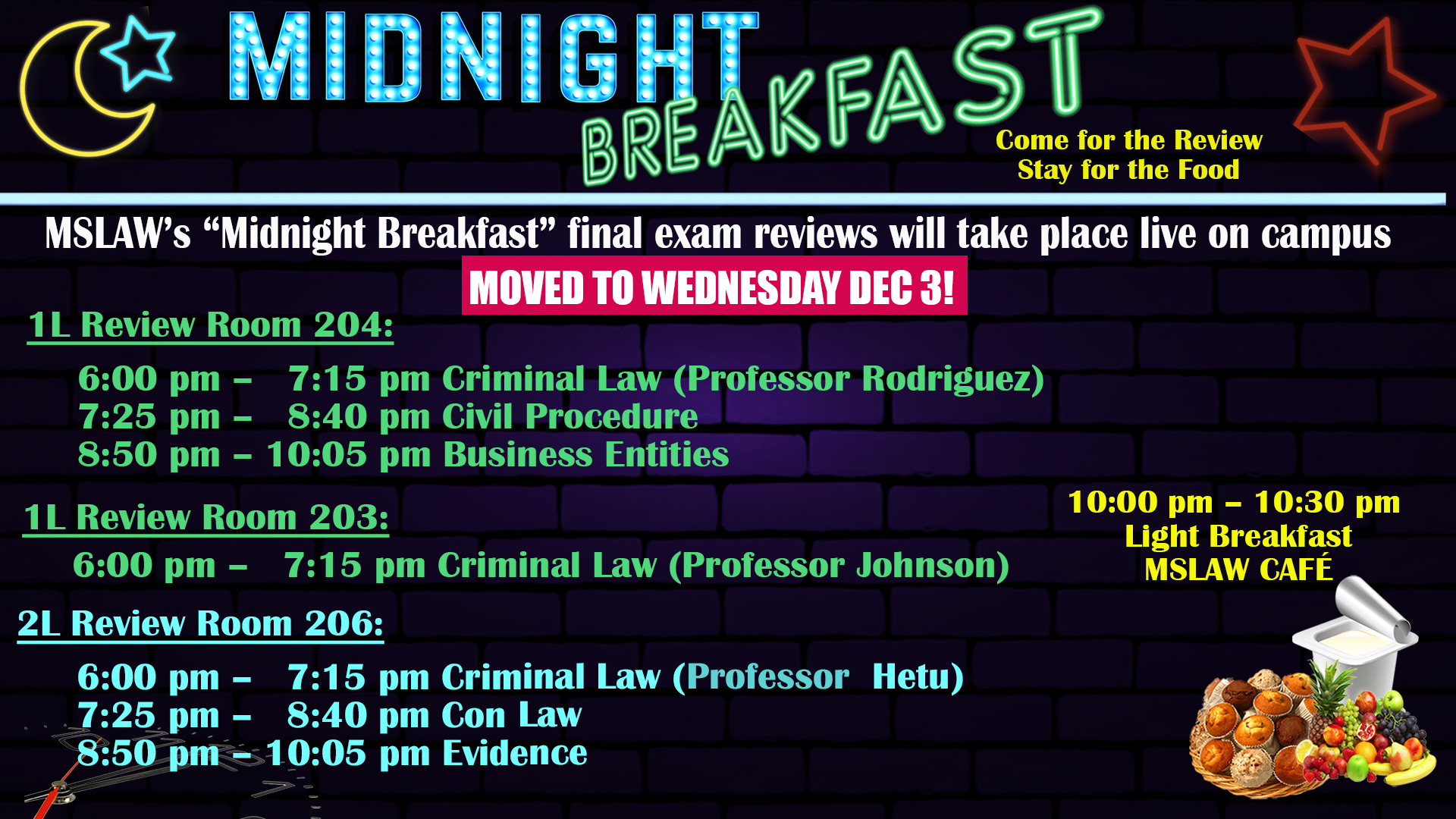 MSLAW’s Midnight Breakfast Final Exam Reviews were held live on campus Wednesday, December 3rd.