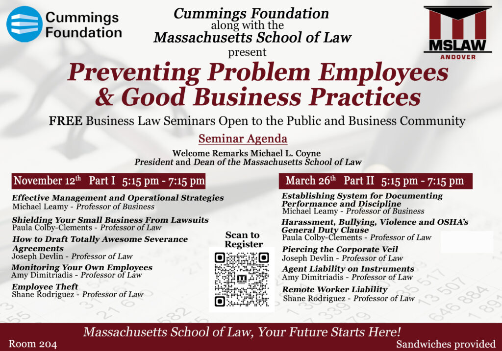Cummings Foundation and Massachusetts School of Law will host a 2-part seminar series in the Fall of 2025 and Spring of 2026. The Fall seminar, Preventing Problem Employees & Good Business Practices, will be held on Wednesday, November 12th, 2025, at Massachusetts School of Law – 500 Federal Street, Andover MA, 01810. This two-part series on Preventing Problem Employees & Good Business Practices comprise the 7th and 8th installments in the Cummings Business Law Seminar Series in partnership with Massachusetts School of Law. These sessions provide a free informative seminar to the public to educate on the interplay between business and law. Slide Decks and Podcasts from Small Business Management II – Wednesday, March 26th, 2025SLIDE DECKS from Small Business Management II – Wednesday, March 26th, 2025PODCASTS from Small Business Management II – Wednesday, March 26th, 2025 Prior Cummings Business SeminarsSLIDE DECKS from Small Business Management I – Wednesday, November 13th, 2024PODCASTS from Small Business Management I – Wednesday, November 13th, 2024VIDEOS from Small Business Management I – Wednesday, November 13th, 2024Past Cummings Business Law Seminars at Massachusetts School of Law (2022 and 2023 Seminars)